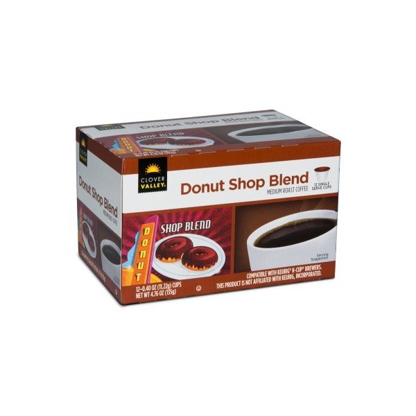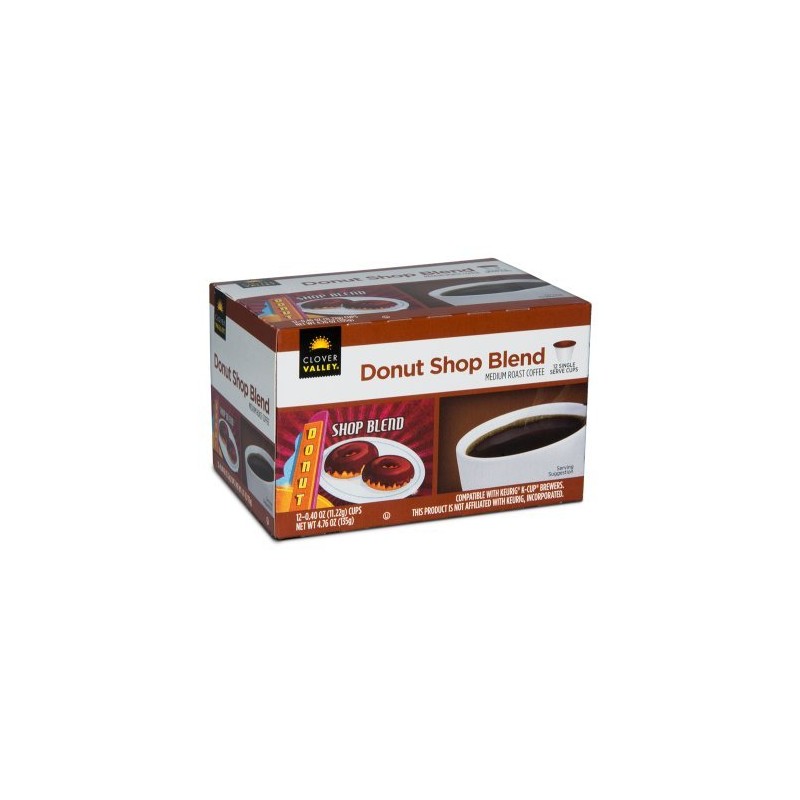 Clover Valley Donut Shop Blend is deliciously smooth and fullbodied. Single serving cups let you enjoy premium coffee taste at any time of day. For use in the Keurig KCup Brewer. Makes 12 single servings Medium roast 100 Arabica beans 120.40 oz (11.22 g) cups This product is not affiliated with Keurig, Incorporated.