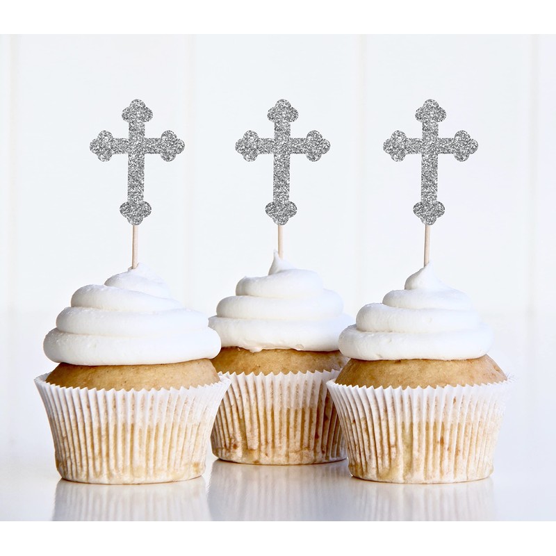 CloverCrafts 12 x Silver Glitter Christian Cross Cupcake Toppers – Christening Party Decor