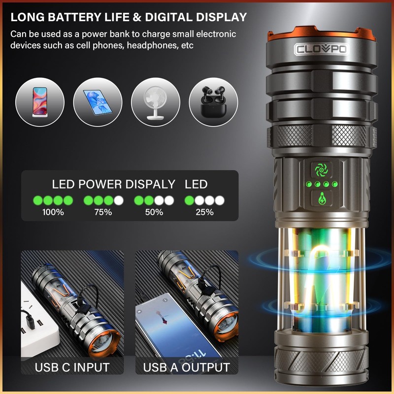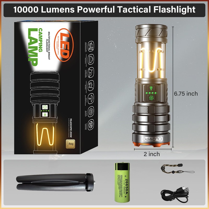 CLOVPO Rechargeable Flashlight 11 Modes Tactical Camping Flashlight with Red-Blue Emergency Lights, 10000 Lumens 3 in 1 Portable Camp Light with Stand, Bright LED Flashlight for Outdoor Activity