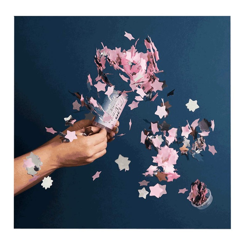 - 2 'we wonder what you are' Plastic push pops with silver foil details, 1 bag of blue star paper confetti, 1 bag of pink tissue paper confetti and 1 bag of silver foil star confetti