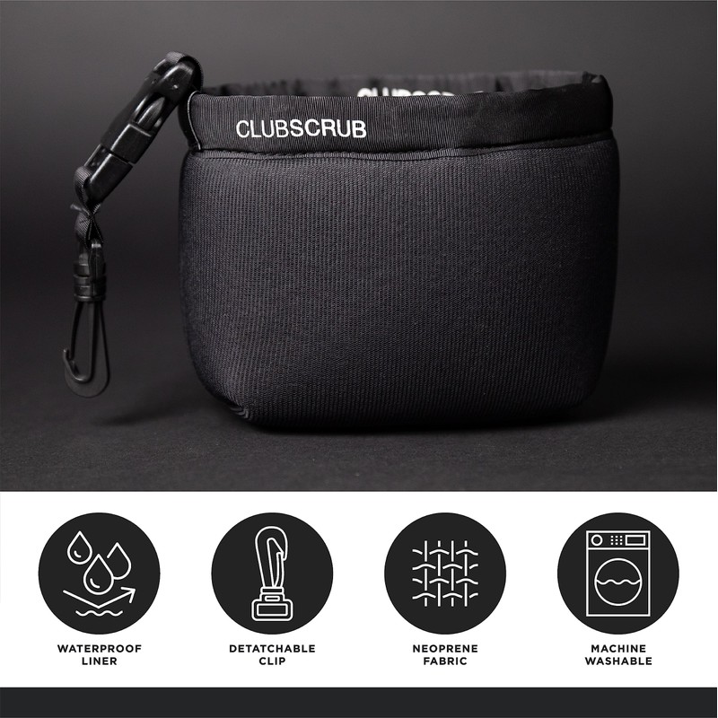Club Scrub Golf Club and Golf Ball Cleaning Bag, Waterproof Clean Face Technology Liner, Perfectly Dry Neoprene Exterior, Detachable Clip, Machine Washable, Cleans Club Grooves, Black