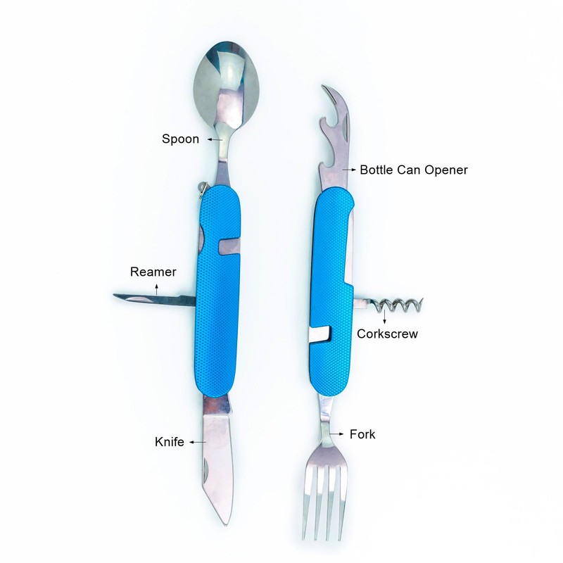 - 6-in-1 Multiple Functions and Widely Application– The camping collapsible utensil combined 6 tools into one kit, including knife, fork, spoon, bottle opener, corkscrew, reamer, great companion for outdoor camping, fishing, hunting, hiking, exploring and EDC.