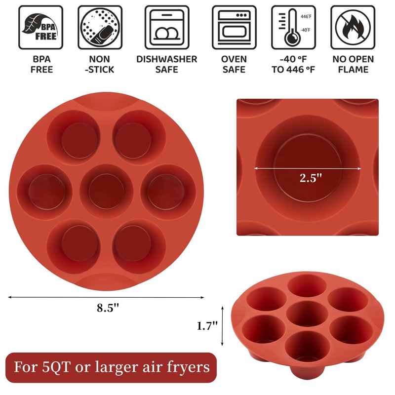 - Fit Size: The cupcake pans are 8.5 inches in diameter and suitable for 5 quart or larger air fryers. Each cup measures 2.5 inches in diameter and 1.7 inches in height.