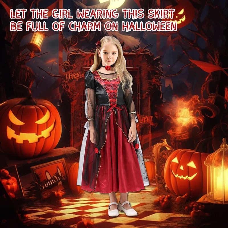 - 【Vampire Costume for Girls】Elegant Halloween vampire costume for kids, including dress, rose necklace, rose hairpin, your girl will be the center of attention at any costume party.
