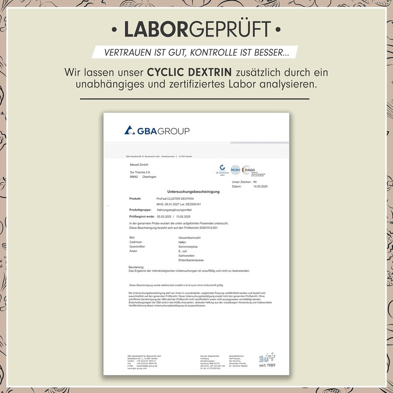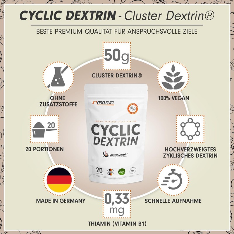 The CYCLIC DEXTRIN contains a specially developed carbohydrate powder made from corn starch with the cluster dextrin. This is a highly branched cyclic dextrin (HBCD) obtained by enzymatic conversion from amylopectin, the main component of plant starch. Thanks to the ring-shaped molecular structure, the body can optimally absorb and use the cluster dextrin powder. We recommend taking 1 to 2 servings daily - ideally with or between meals as well as before, during or after a physical exertion.