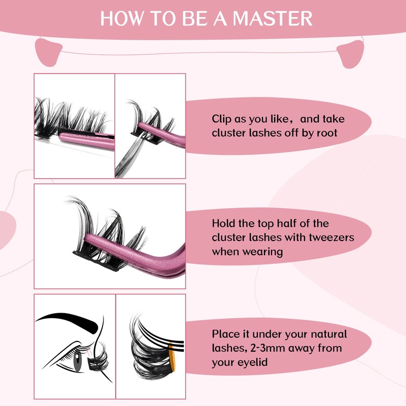 - How to use: Apply the eyelash glue to your natural eyelashes and wait for approx. 30 seconds before gently peeling off the eyelashes from the strip by gripping them at the root. Then stick the eyelash clusters under your natural eyelashes, 2-26 mm away from the eyelid. You are now ready to start your day with your new eyelashes!
