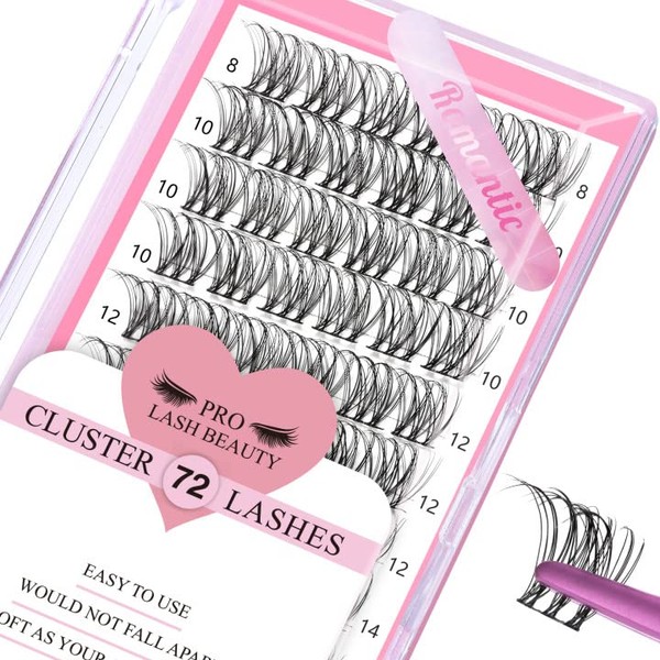 Cluster Eyelashes, Pack of 72 Individual Eyelashes, Eyelash Clusters, DIY Eyelash Extensions, Super-Thin Band, Reusable, Soft & Comfortable (Romantic-D-8-16 Mix)