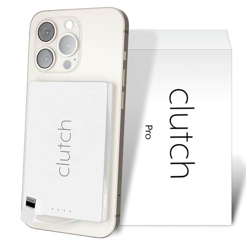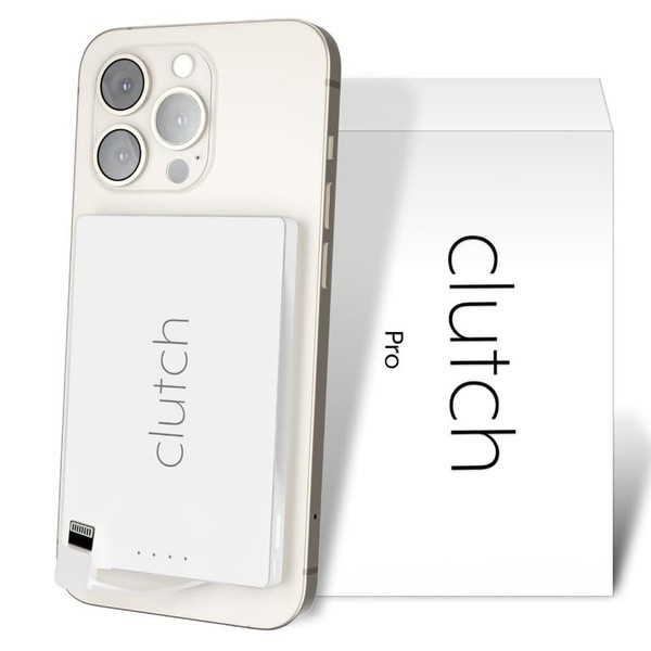 Clutch Pro Portable iPhone Charger for Travel 5000 mAH TSA Approved Magnetic Airplane Safe Portable Charger only Compatible with iPhone 14 & Older Devices with Built-in Lightning Cable 3.7 oz - White