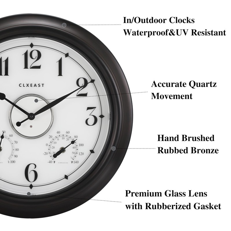 - ✅【Waterproof Outdoor Night Light Wall Clock 】 This Oversized painted&hand brushed Oil Rubbed Bronze 18 Inch large outdoor clock is UV resistant,sealed with front and back rubberized gasket for protection from water and other outdoor elements.An elegant timepiece for your outdoor garden,pool, patio or backyard,porch,modern farmhouse living room,dinning room,bathroom,kitchen,fireplace,entryway,home offce.