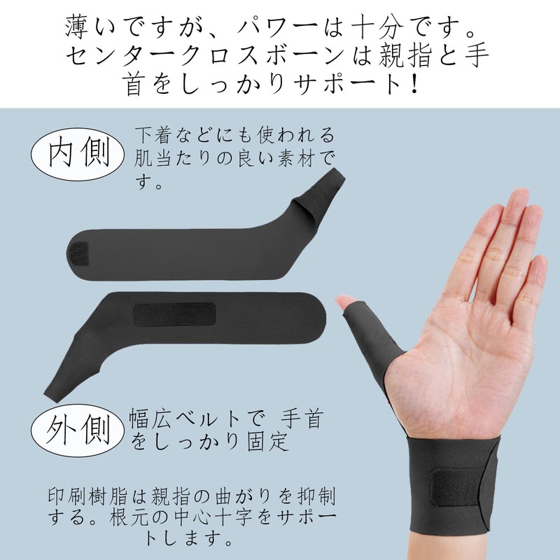 - 【想像以上のフィット感】右手で使用動きやすいのにズレにくい手のサポーター。薄いですが、力は強いです。センタークロスボーンは突然やってきた親指・手首をしっかりサポートしてくれます。