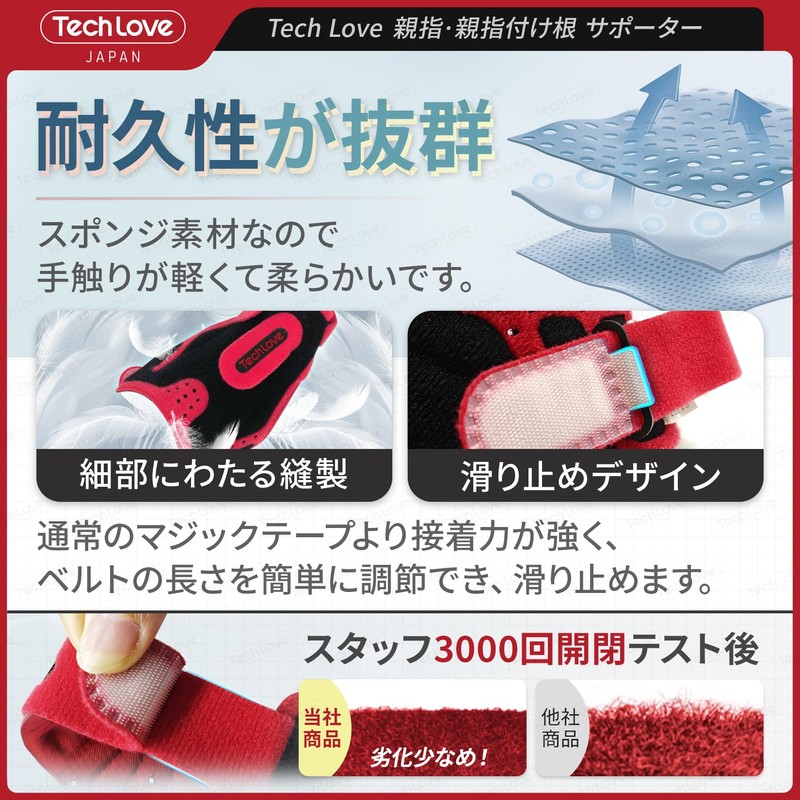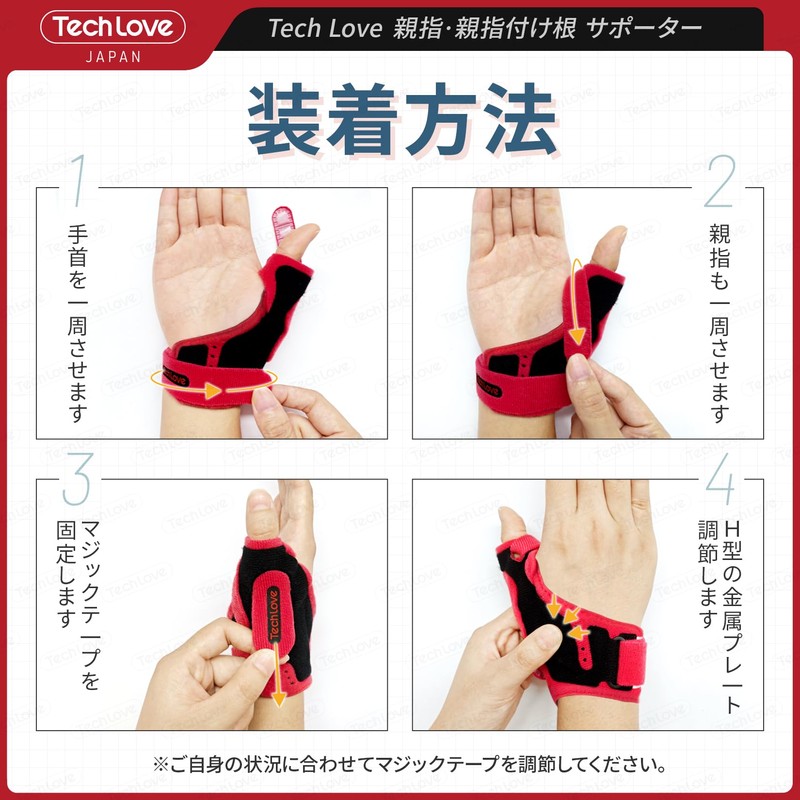 - ✅「Techlove 親指サポーター」固定範囲が調節可能なH型金属プレートで親指の付け根をしっかり固定し、親指の過度な動きを制限することで、腱鞘炎やCM関節の痛を緩和します。指先が自由に動かせるデザインなので、日常生活の細かい作業やパソコン、スマホの操作も便利に行えます。