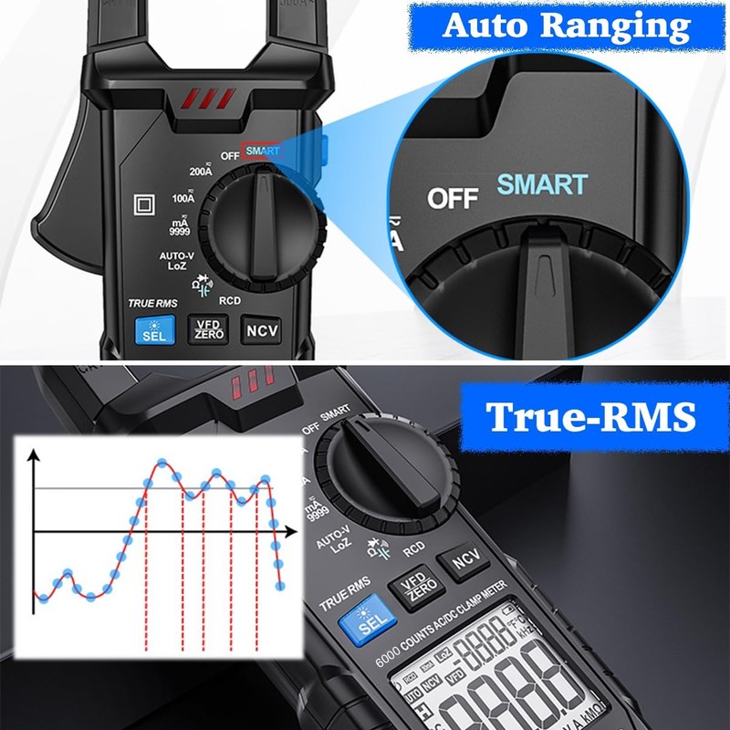 - More: Digital clamp meter features True-RMS for accurate readings of non-sinusoidal waves; Auto Range for the best ranging for the measured parameters; SEL for selecting between AC and DC voltage and current input