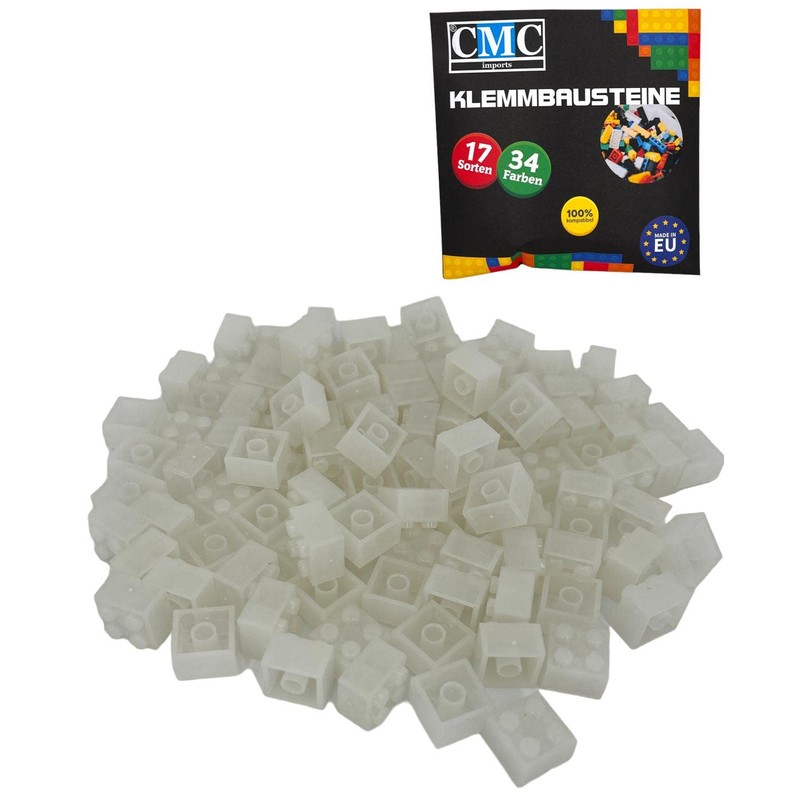 CMC imports 50 Clamping Blocks, Building Blocks, Basic Building Blocks, 2 x 2 Nubs, Compatible Bricks, 34 Different Colours (200 - Glow in The Dark)