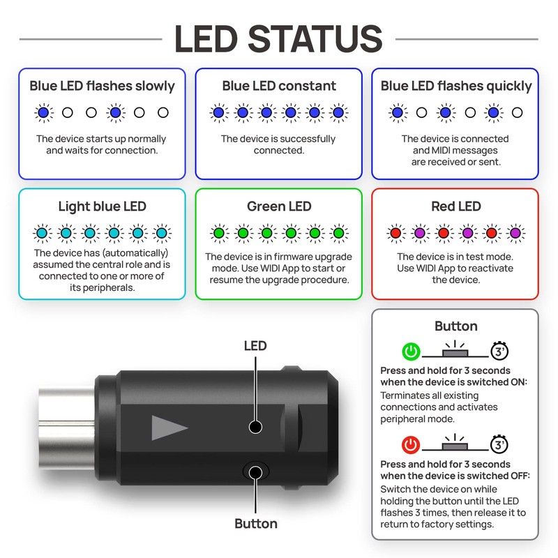 - [!! Attention !!] General Bluetooth pairing does not work for Bluetooth MIDI. Update firmware via WIDI App first. Follow the exact pairing instructions for optimal performance. Get 24/7 support via bluetoothmidi(dot)com.