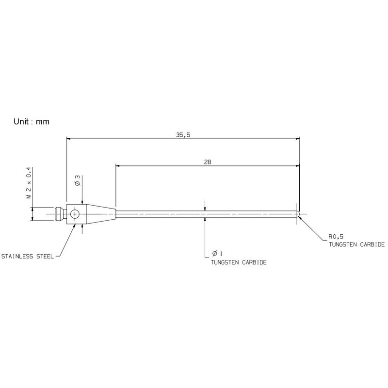 - 1mm diameter ball tip,M2 thread shank,Tungsten carbide stylus. 35.5mm long.