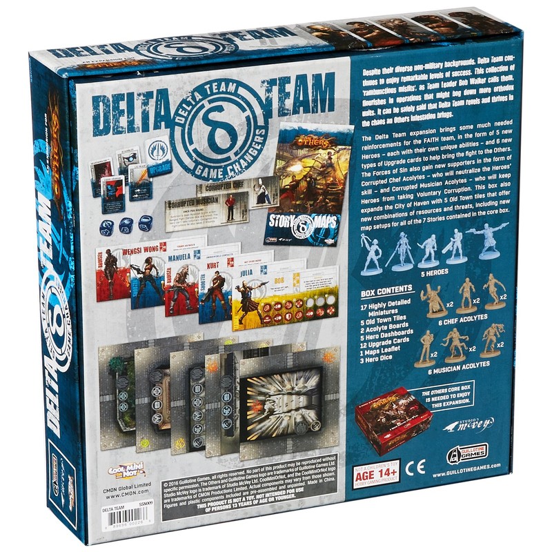 The others: Delta team box is just what fans of the game need to expand its universe. There are five new heroes with ice water in their veins, ready to take on whatever sins get thrown at them. The town just got a little bigger with five new map tiles. Players can now visit places like the castle, the war Memorial and the library in their pursuit of evil. There are also 12 upgrade cards included with six totally new upgrades like the lazy blades or the often helpful, liquid courage. This pack is a must have for players ready to take the next step in the others.