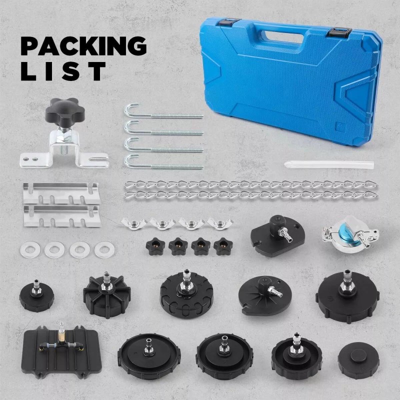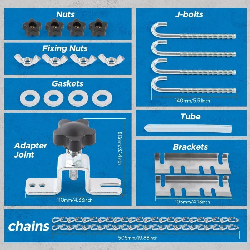 Package List: 12× different size adapters 1 × japanese quick connector 4 × screw plugs 2 × bracket 4 × J-bolts 2 × chains 4 × washers 1 × carrying case Specifications: Item Weight: 7.3 pounds Package Dimensions: 19.25 x 11.85 x 3.62 inches |