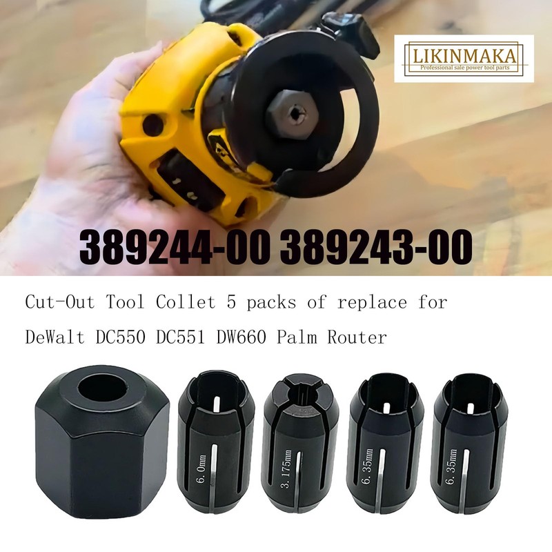 CN1 389244-00 389243-00 Collet and Nut Kit Replace for DeWalt DC550 DC551 DW660 Palm Router RotoZip spiral saw tools and Drywall routers(5packs)