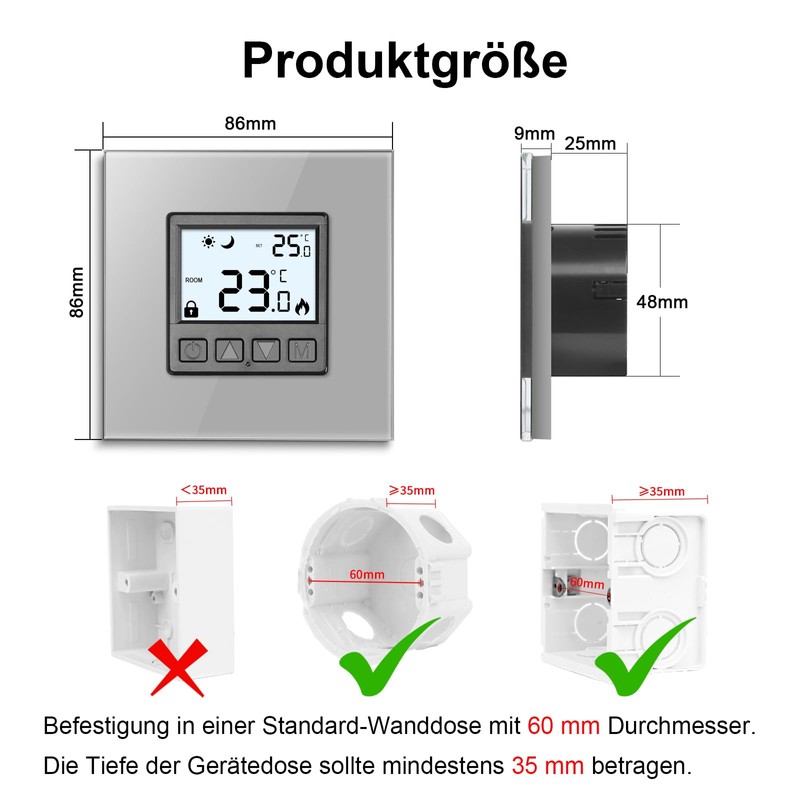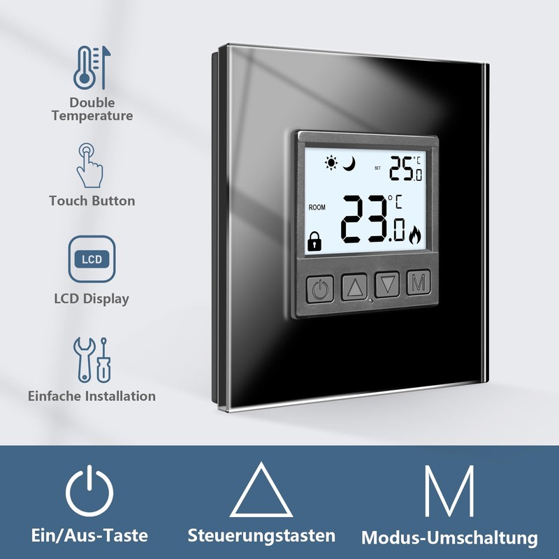 - Multiple functions: temperature calibration, high/low temperature protection, child lock, frost protection, save power off data, reset and other functions. Please read the instructions carefully before installation.