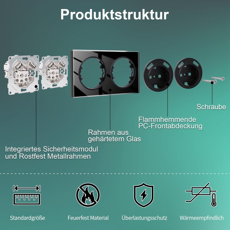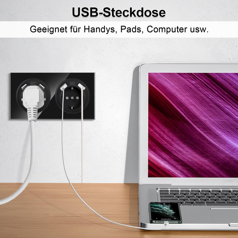 CNBINGO Double Socket Flush-Mounted with Claws - Glass Schuko Socket with USB-A (Max 2.1 Amp Total) - 16 Amp Wall Socket - Black