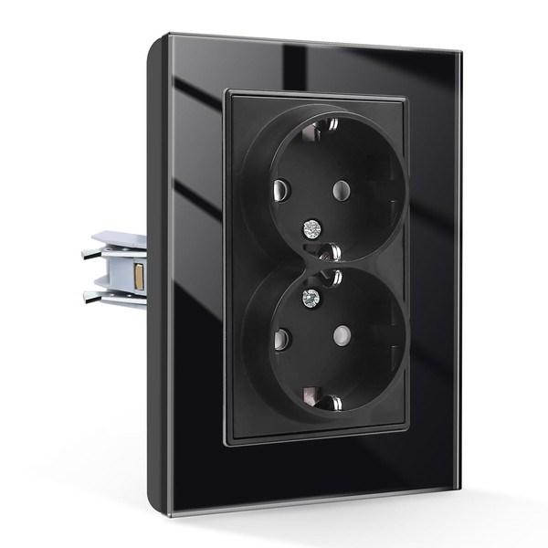 CNBINGO Glass Double Socket Flush-Mounted, 2-Way Socket Flush-Mounted, Double Wall Socket with Plug-In Terminal Sockets, Black
