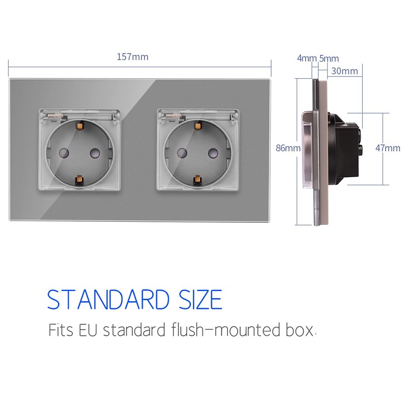 - EU standard: 86 mm x 146 mm, screwless snap plate, modern design; 30 mm mounting box depth, easy to install.