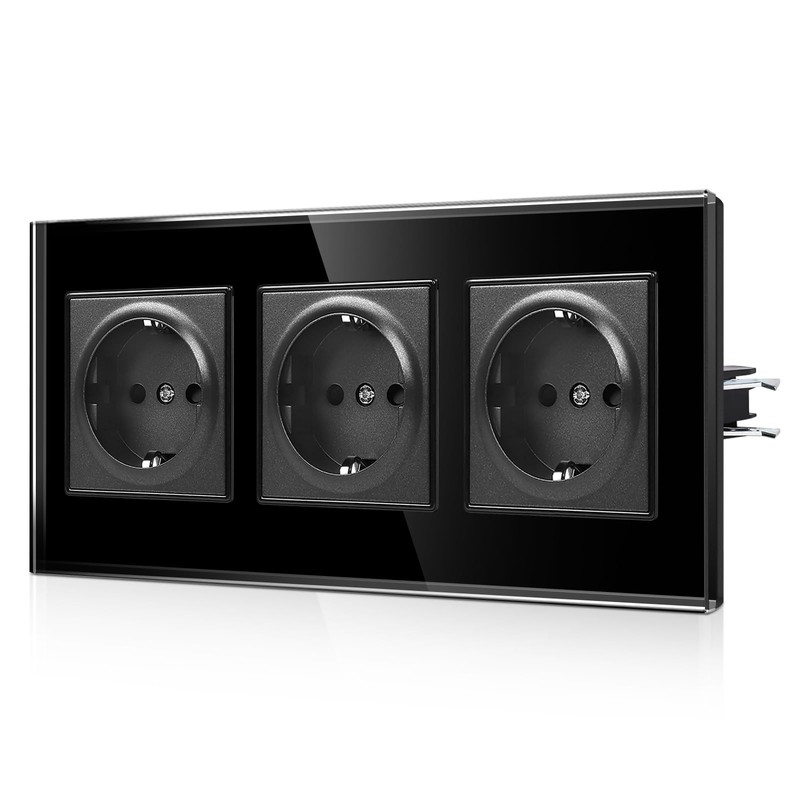 CNBINGO Schuko Socket with Claws - Triple Wall Socket with Glass Panel - 16 Amp EU Standard Socket Flush-Mounted with Child Lock - Triple Black