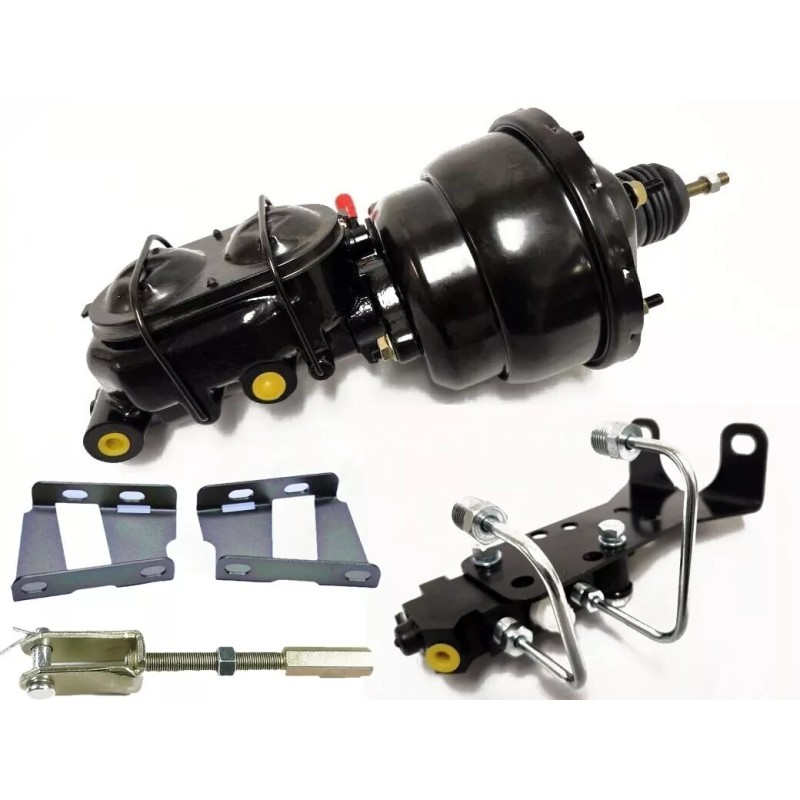 Brand new 7" Dual BLACK brake booster with black Bail Top Master cylinder and Zinc Bracket Kit designed for many years of classic Chevy vehicles, like the Bel Air Biscayne 210 C10 Panel Truck- anything with a need for a slightly angled firewall mounted booster kit. This is the best deal you'll find on a quality setup like this. This 7" booster is ideal for most small to mid size street rods and customs. The 7" dual booster offers 27% better stopping power over 7" single boosters, making this setup much better for increased safety on your vehicle. This is the best deal you'll find on a quality setup like this. The booster mounts with a 4-bolt pattern. The 4 bolts are in a perfect square and are 3 3/8" apart (center to center).