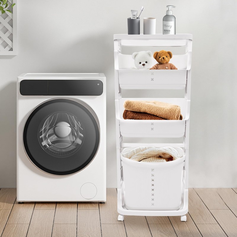 - 【Storage Assistant】The cleverly categorized 4-tier design makes it easier to sort dirty clothes, hygiene products and more. The upper tier is the ideal storage area for detergents, cleaning products and more.