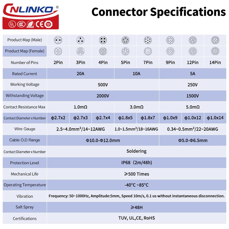 - Standard: cable specifications: 4.0 mm2/12AWG; cable diameter range (power): F9.0 ~ F12.0 mm; contact diameter × Numéro: Φ2.7x2; durability: ≥500 plug-in/disconnect cycles; temperature range: -40°C ~ 80°C; mounting method: welding
