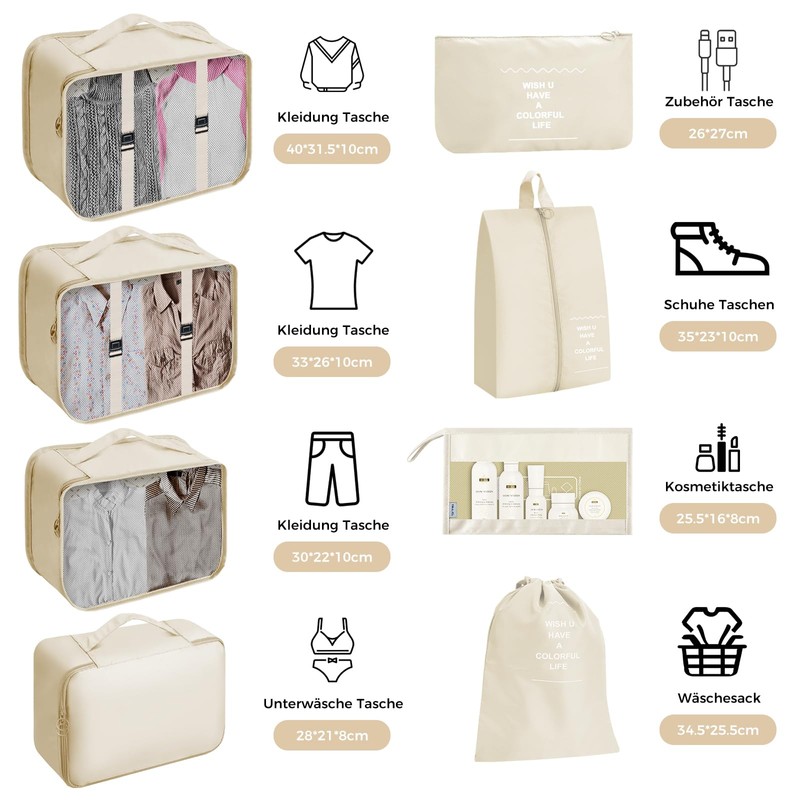 CNMTCCO Suitcase Organiser Set, 8-Piece Packing Cubes, Packing Cubes for Holidays and Travel, Travel Organiser Set, Packing Bags for Suitcase Suitcase (Beige)
