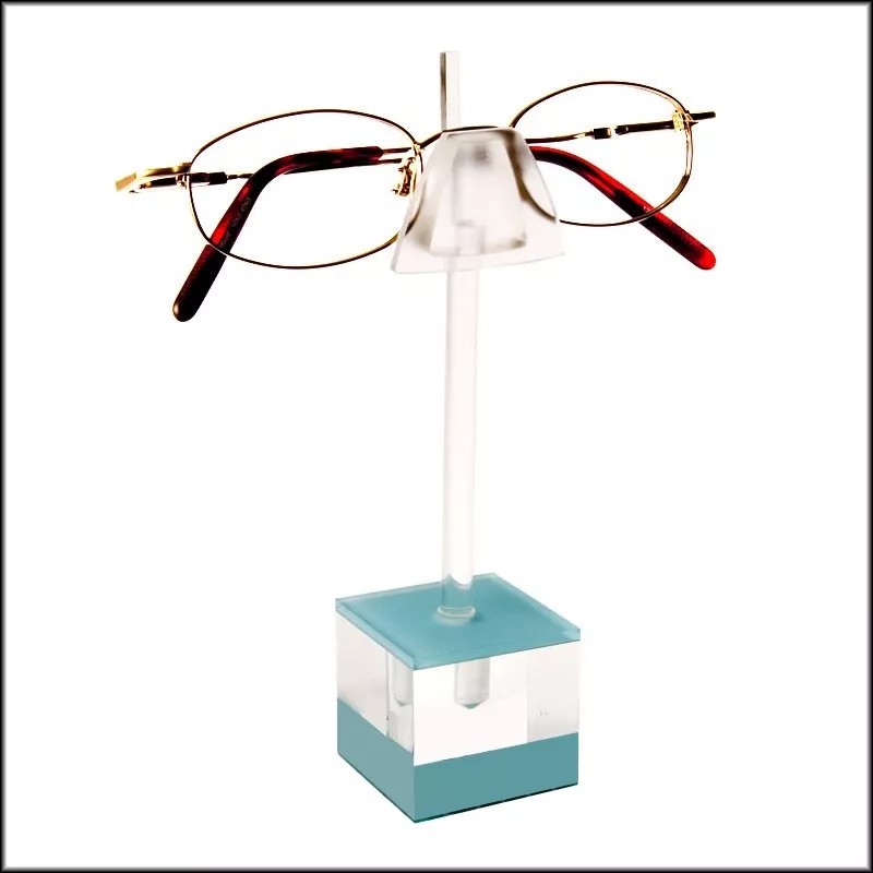Laser cut cube eyewear displays in high quality acrylic with a single nose peg attached to a set stem. Your choice of one of ten vibrant colors adorns the top and base of the clear block.