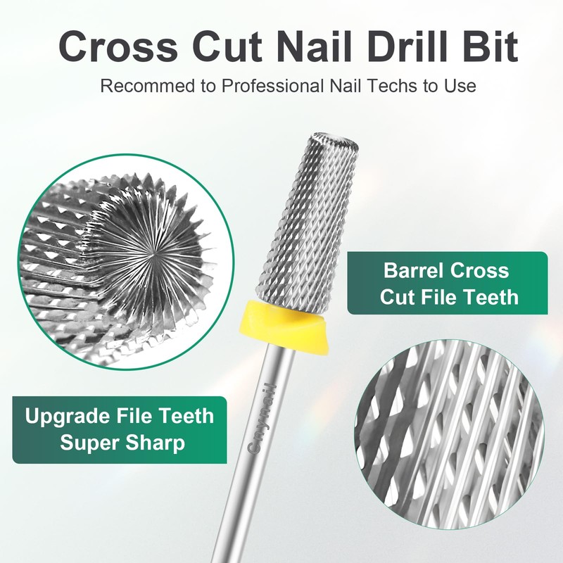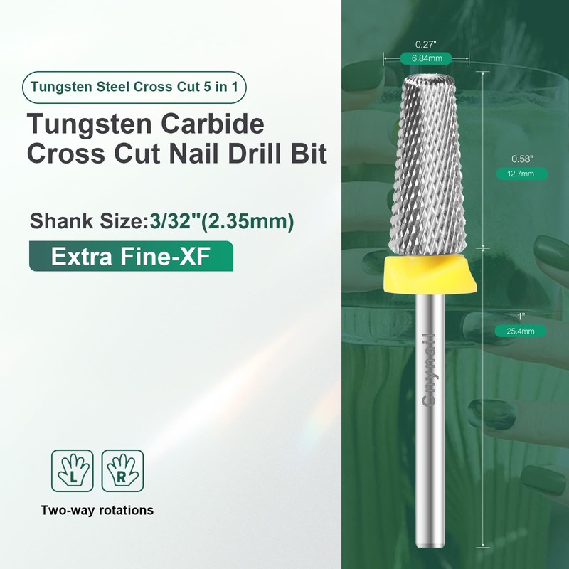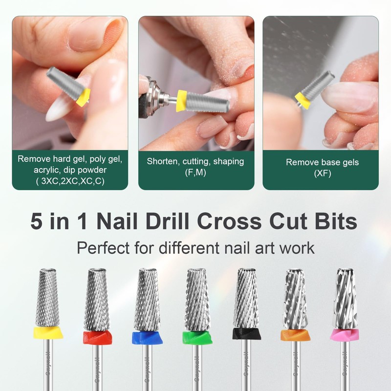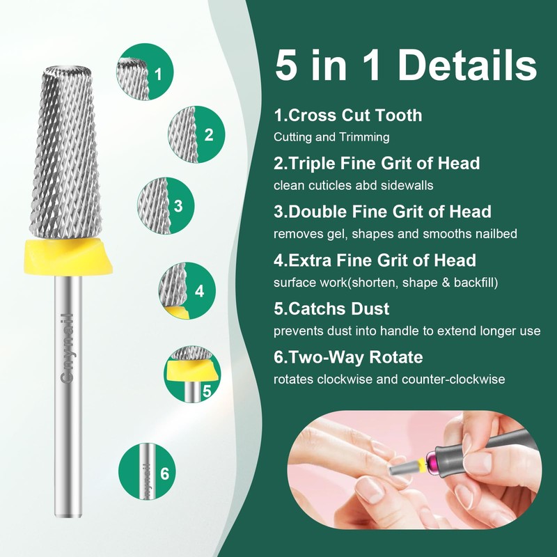 - 5-in-1 Cross Cut Nail Drill Bit: Features top-to-bottom variable grit design—ultra-fine on top, extra-fine in the middle, and fine at the base. Perfect for shaping, grinding, smoothing, cuticle cleaning, and removing gel, acrylic, or nail powders. Includes a dust-proof ring to protect your drill