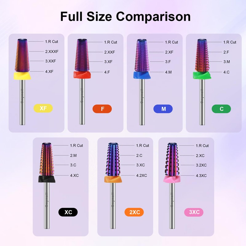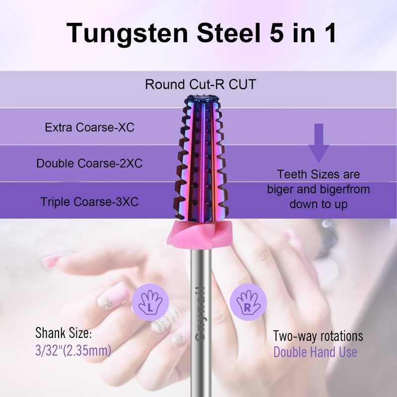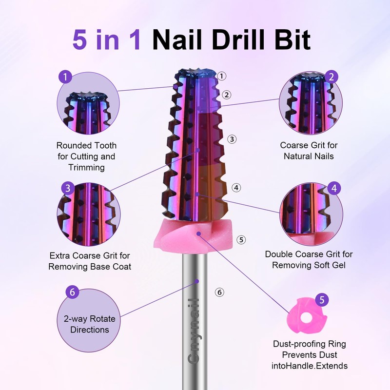 Cnynail 5 in 1 Nail Drill Bit, Tungsten Carbide Multi-Function Bit for Acrylic Nails, Hard Gels, Cuticles Removal, 3/32" Shank, Two-Way Rotation for Left & Right-Handed Use (3XC Grit, Purple)