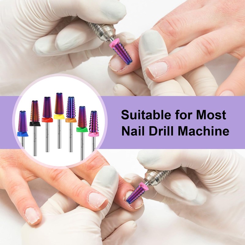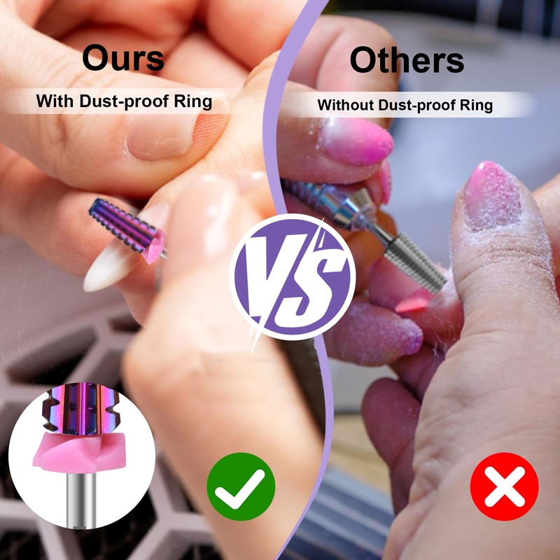 - 5-in-1 Nail Drill Bit: Features top-to-bottom variable grit design—ultra-fine on top, extra-fine in the middle, and fine at the base. Perfect for shaping, grinding, smoothing, cuticle cleaning, and removing gel, acrylic, or nail powders. Includes a dust-proof ring to protect your drill