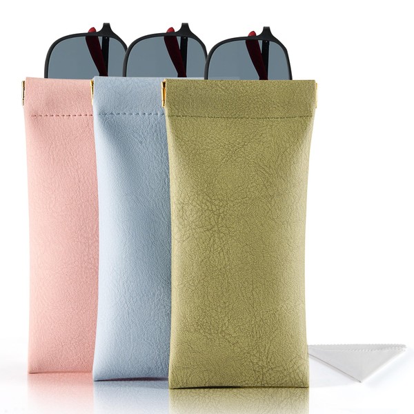 CO-Z 3 Pack Sunglasses Case, Squeeze Top Glasses Case with Cleaning Cloth, Ultra Light Soft Eyeglass Cases for Women Men, PVC Leather Portable Eyeglass Pouch, Pink, Green, & Blue