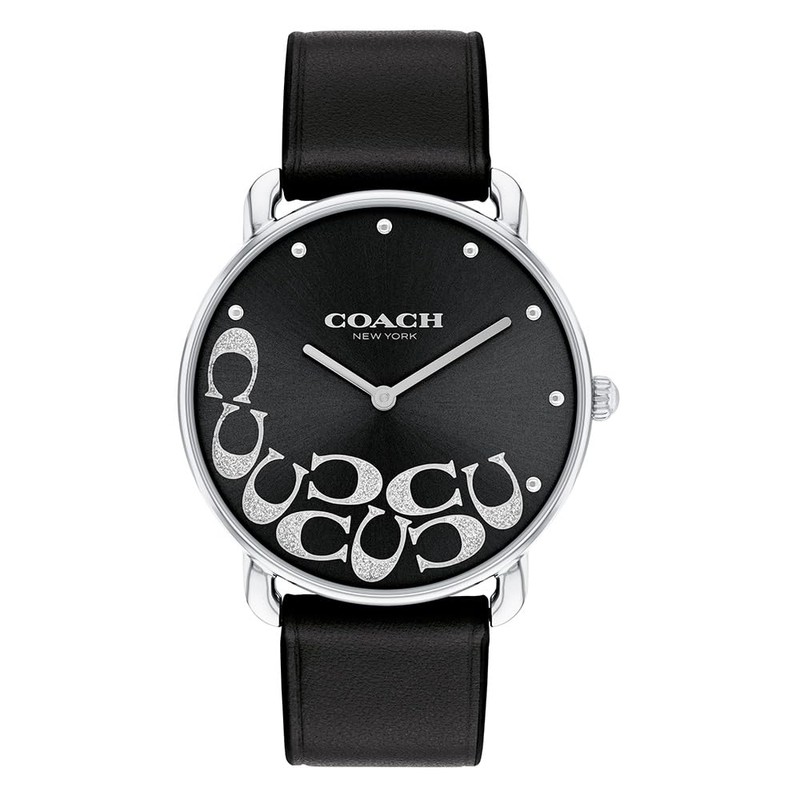 - With clean lines and a modern minimalist feel, Elliott is a true design classic perfect for the work day or weekend. Finished with a black leather strap, this stainless steel round watch features a black sunray dial with domed markers and Coach signature detailing with diamond dust for a subtle shine. Features a stainless steel case with a black leather strap