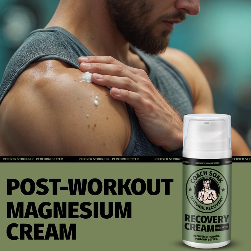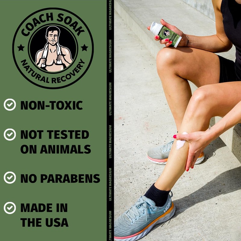 • Coach Soak's Magnesium Lotion, designed for athletes, offers quick absorption directly onto the skin. Experience the benefits of magnesium chloride with a menthol sensation. Same quality, new packaging! Your purchase includes a copy of our ebook "How Magnesium Aids Post-Workout Recovery".