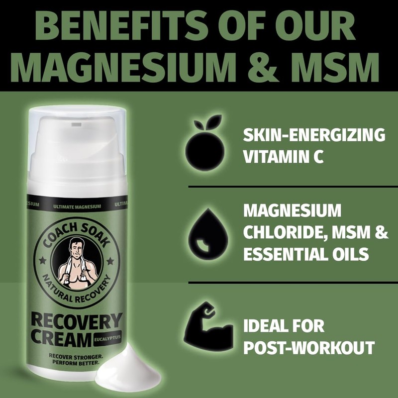Coach Soak Coach Soak Magnesium Cream with MSM in Pump Bottle - Natural Recovery Cream with Magnesium Chloride & Menthol - Fast-Absorbing Cream for Muscles & Joints, Eucalyptus 3.4oz