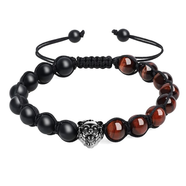 COAI Men's Bracelet with Lion Charm, Onyx Red Tiger Eye, Red Tiger Eye