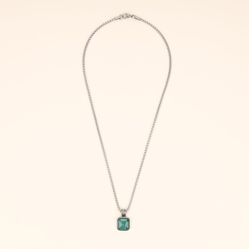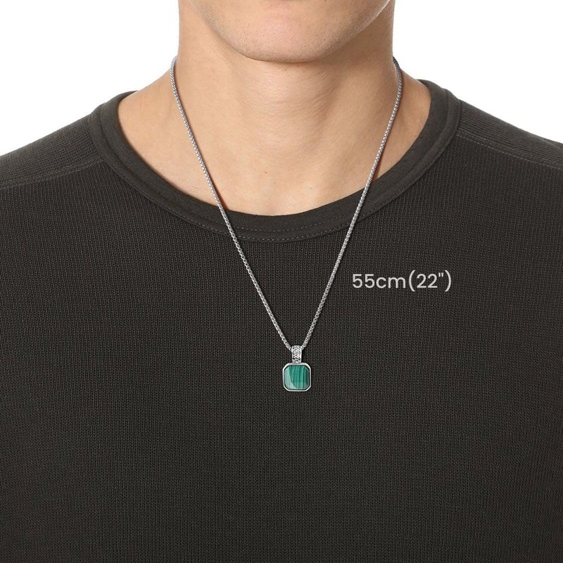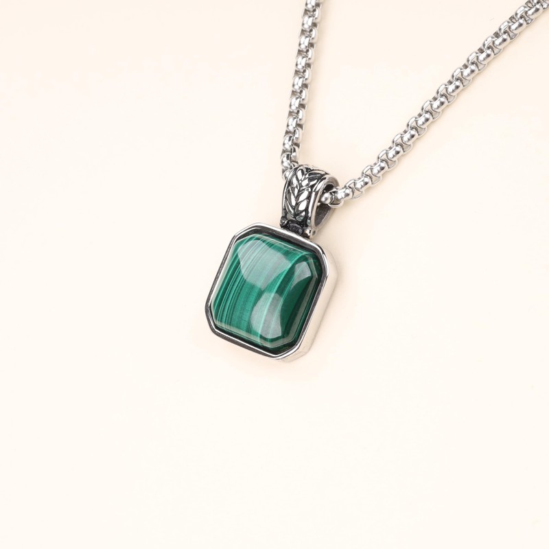 • This men's necklace is made with materials from imported Grade A 15mm semi-precious gemstones Malachite pendant to stainless steel box chain