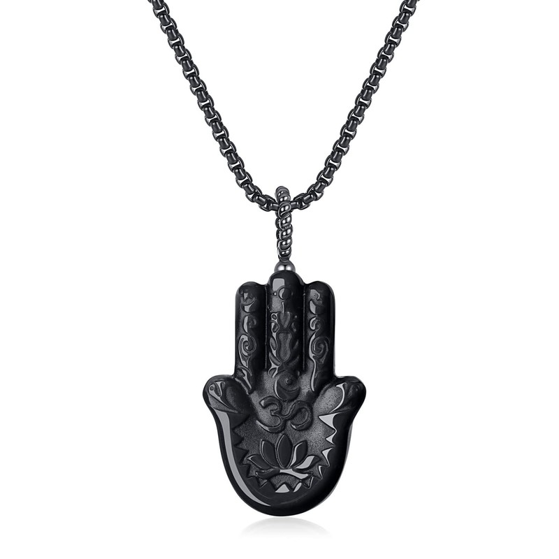 - The necklace combines the properties of the semi-precious stone obsidian with Hamsa hand and lotus engraving, ideal as an amulet or simply as a chic piece of jewellery