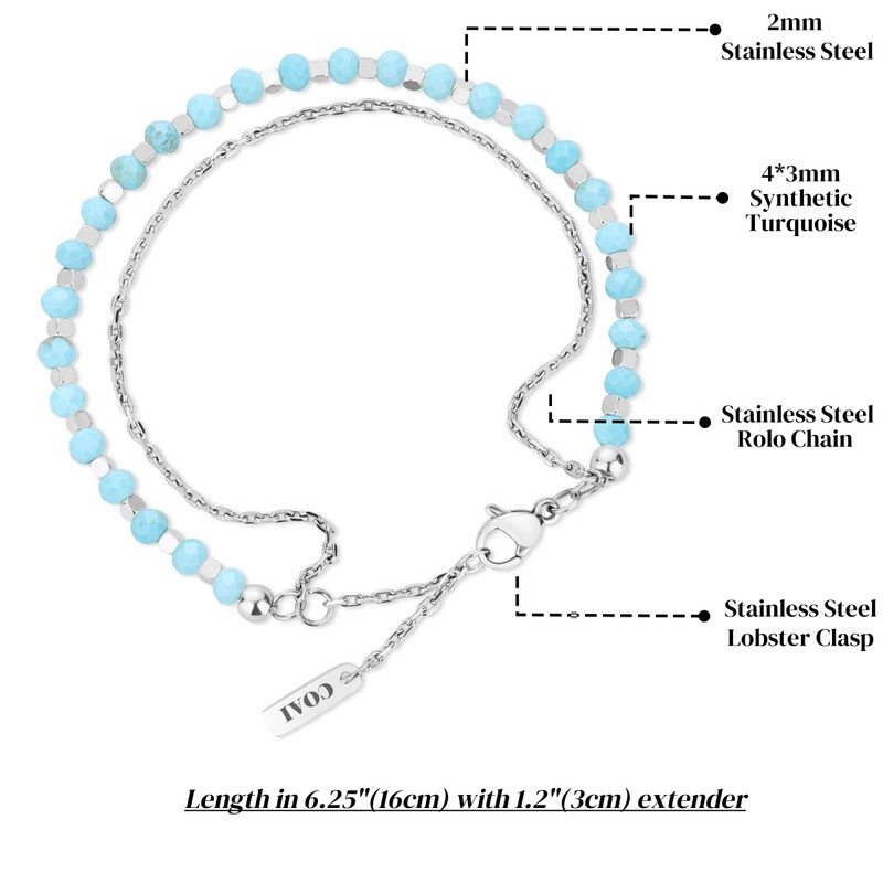 - Material: women's gemstone bracelet with faceted 4 x 3 mm turquoise beads and 2 x 2 mm stainless steel squares