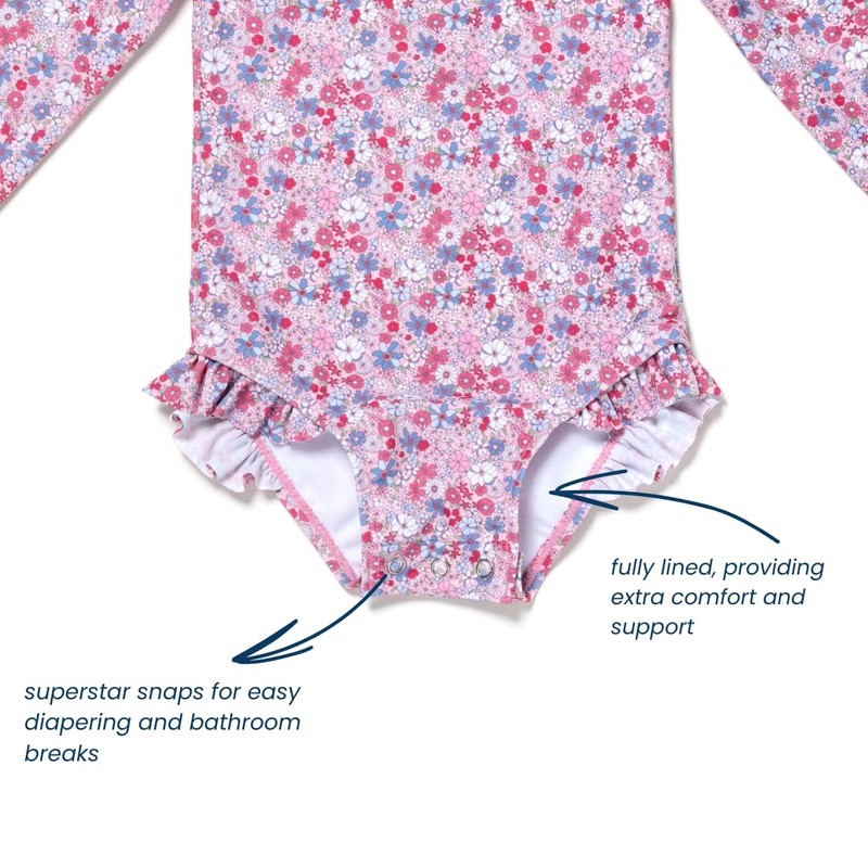 Coast & Crest Baby and Toddler Girl Long Sleeve Rash Guard One Piece Swimsuit Pink Petal Pals 12-18M