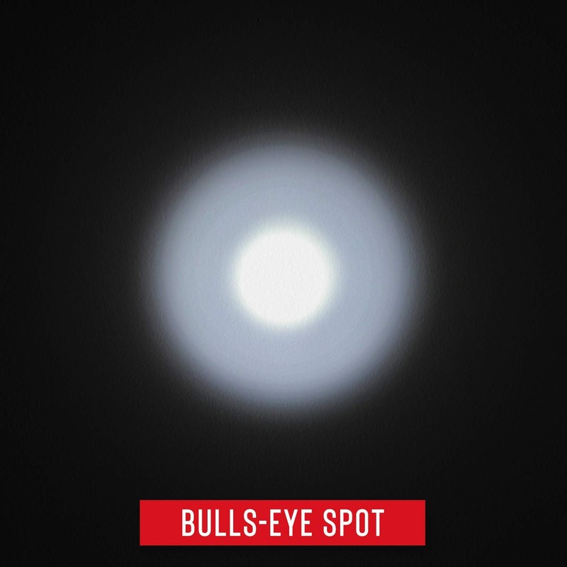 - BULLS-EYE SPOT BEAM: Hit your target with power. Always on point, the Bulls-Eye Spot Beam fixes a bright “hot spot” on the object, surrounded by a soft halo of transitional light to increase the total field of view. From spotting animals in the woods to identifying suspects, this beam cuts through darkness.