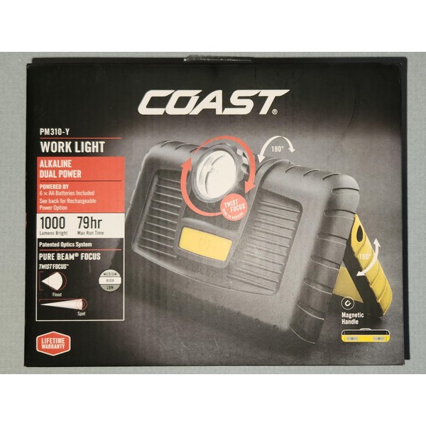 Coast PM310-Y 1000 Lumen LED Work Light with Rechargeable Battery Option, Modern Design, Surface Mount, 79 Hour Runtime
