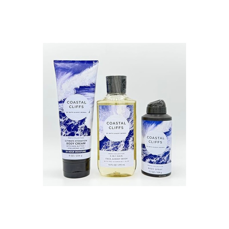 - Coastal Cliffs Men's 3-Piece Bath and Body Bundle | Ultimate Hydration Body Cream, Hair & Body Wash and Body Spray.