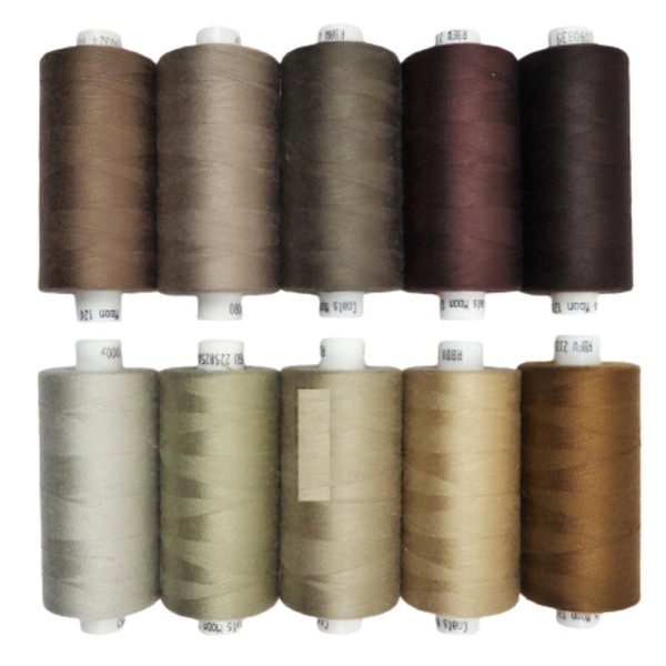 Coats Moon Assorted Sewing Thread - Box of 10 Reels, Coats Moon Polyester All-Purpose Thread for Sewing, Overlocking, Stitching, and Quilting, 1000 Yards per Reel, 120's (Dark Neutral Shades)