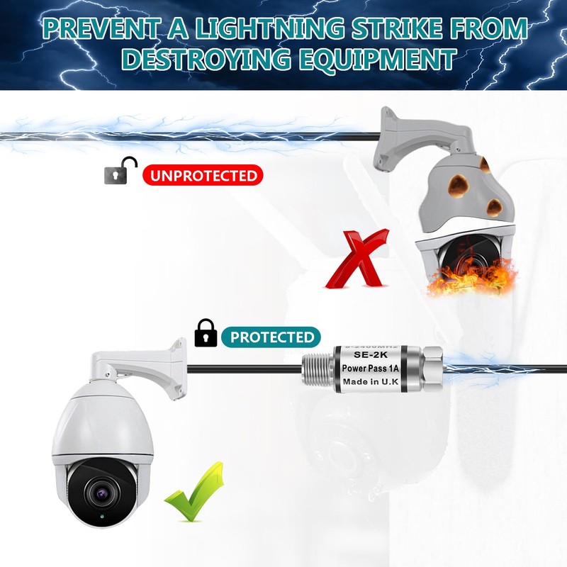 • PROTECT YOUR DEVICES: Safeguard your home and office electronics from lightning strikes with our Surge Protector. Suitable for satellite, antenna, and cable TV setups, it ensures your valuable equipment stays safe during thunderstorms.