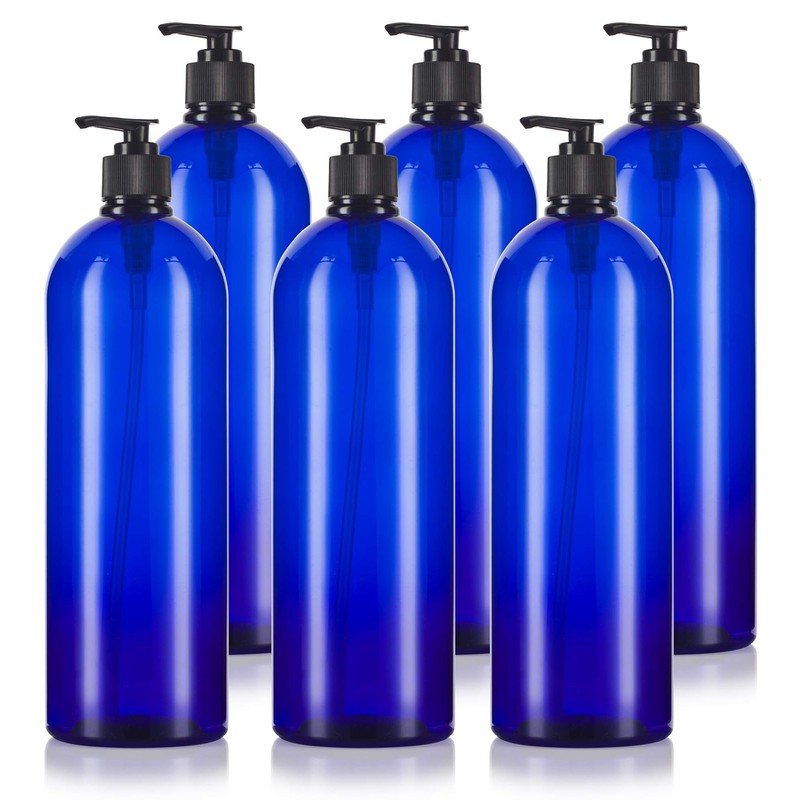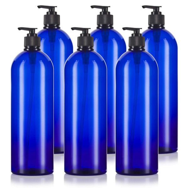 JUVITUS 32 oz Cobalt Blue Boston Round PET Bottles with Black Lotion Pump (6 pack)